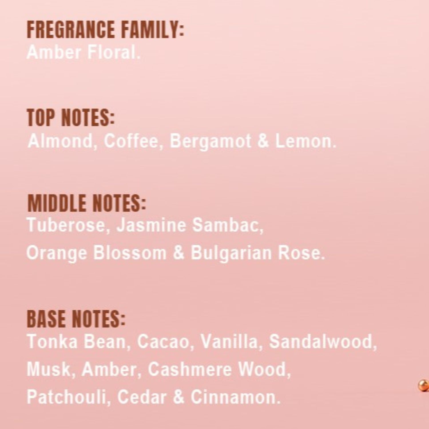 | BASE NOTES | Tonka Bean, Cacao, Vanilla, Sandalwood, Musk, Amber, Cashmere Wood, Patchouli and Cedar. |