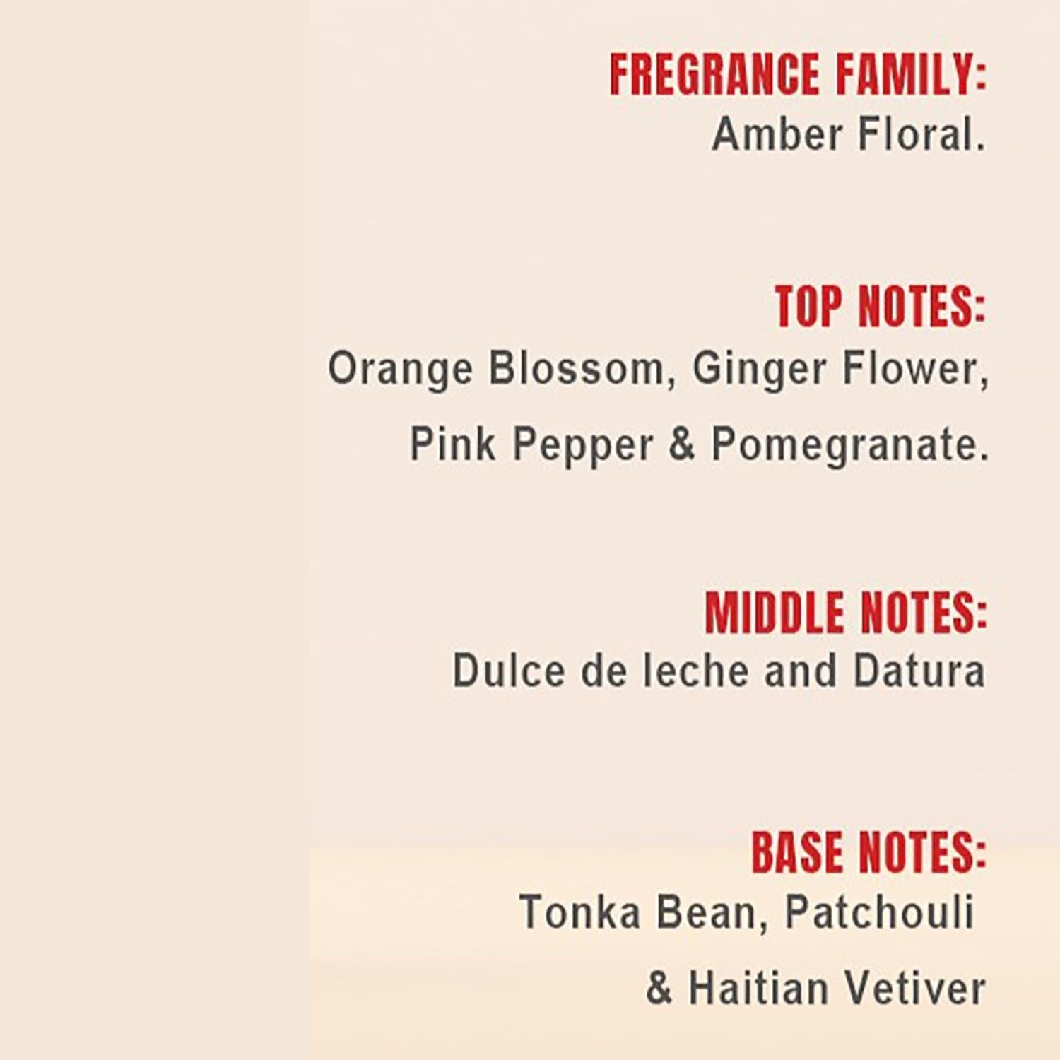 Orange Blossom, Ginger flower, Pink Pepper and Pomegranate. |